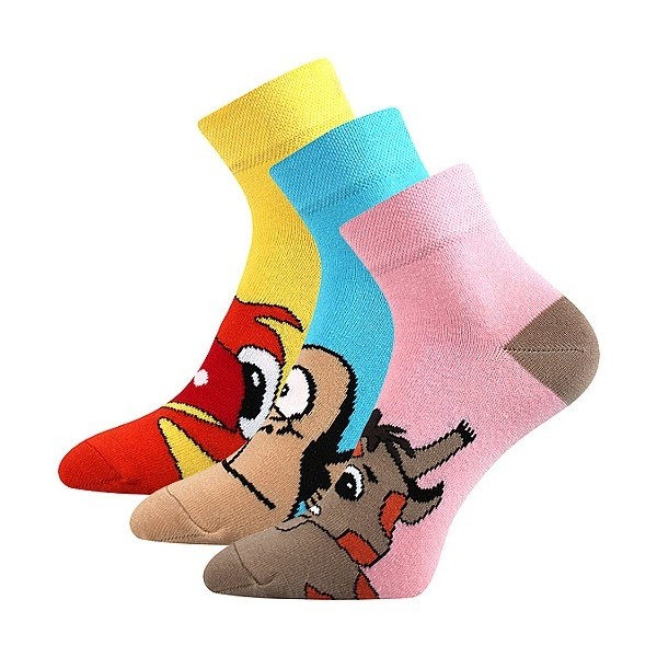 Dámské tenké ponožky Boma® JITULKA jsou vtipné a veselé ponožky na každý den. Barevné ponožky se zvířecími motivy mají výšku nad kotník. Ponožky jsou pletené z přírodní bavlny s podílem elastanu, jsou příjemné na omak, dobře se nosí a výborně pohlcují vlhkost. Zároveň jsou pružné a dobře si drží tvar. Lem je volný a nohy nestahuje a nepříjemně neškrtí. Jakmile si zujete boty, na svět vykouknou kočka, beruška nebo zebra. K dostání ve výhodném balení 3 párů. Bavlněné ponožky se zvířátky si hned zamilujete.