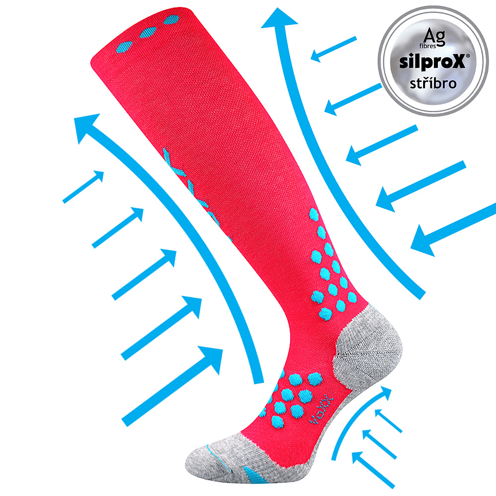 Kompresní podkolenky mají řetízkovanou špici a speciální konstrukci zamezující přetáčení v botě. Anatomicky tvarované polstrované zóny brání vzniku otlaků a puchýřů. Stahující podkolenky mají netypicky vyvzorovanou patu a jedinečné puntíkované polstrované zóny proti otlakům. Díky kompresi napomáhají pevnějšímu držení a vyšší stabilitě kotníku, zapletením materiálu silproX® s ionty stříbra zajišťuje antibakteriální ochranu a jemné polstrování materiálem DRYTEX zajistí maximální komfort a odvod potu při vysoké sportovní zátěži. Kompresní podkolenky jsou v teplotní třídě A, vhodné do rozmezí teplot od +10°C do +35°C.