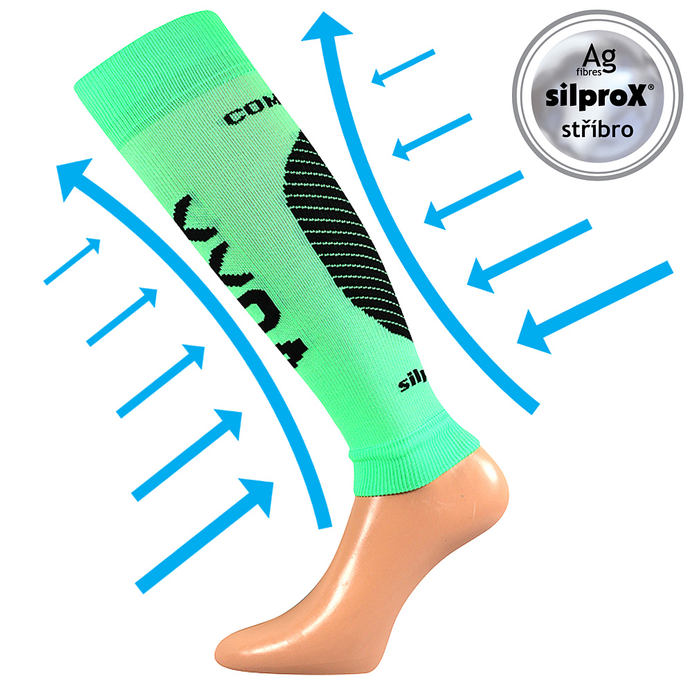Pozitivně působí na krevní oběh díky stupňovitému masážnímu tlaku. Veselé návleky v pestrých neónových barvách užijete při mnoha sportovních aktivitách. Další výhodou je antibakteriální ochrana ionty stříbra v materiálu silproX®, chrání před vznikem bakterií a tím i zápachem. Prodyšné zóny zajišťují dobrý odvod potu od pokožky. Kompresní návlek v teplotní třídě B, je vhodný do rozmezí teplot od -5°C až +20°C.
