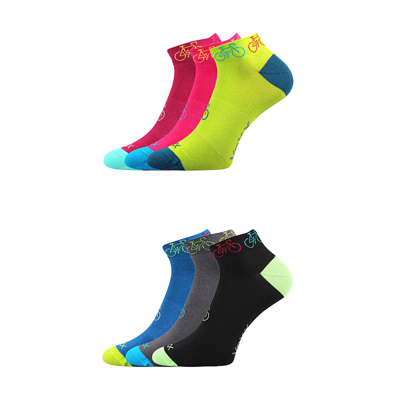 Tenké nízké ponožky VoXX® REX 13 jsou dámské ponožky, které se hodí jak na celodenní nošení, tak i na letní indoorové a outdoorové aktivity, s barevnými bicykly v lemu. Sportovní ponožky s vyšším podílem bavlny pro dobrý odvod vlhkosti mají navíc prodyšnou zónu na nártu a jemný nestahující lem. Aby se v obuvi nepřetáčely, okolo nártu mají elastickou zónu, držící ponožky na svém místě. Slabé ponožky mají špici uzavřenou řetízkováním, takže nikde netlačí a nezpůsobuje otlaky ani puchýře. Letní ponožky v teplotní třídě A jsou vhodné do rozmezí teplot od +10°C do +35°C.