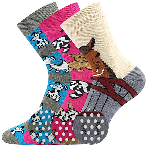Dětské silné ponožky Boma® SIBIŘ 07 jsou hřejivé ponožky s barevnými obrázky pro kluky i holky. Velmi jemné a teplé ponožky jsou příjemné na nošení. Dětské veselé ponožky Boma® s protiskluznými puntíky mají zesílené froté chodidlo tlumící nárazy, nohy tak mají dítka jako v bavlnce. Díky pružnému elastanu dobře drží tvar a nepadají dolů. Bavlněné ponožky jsou hebké na omak dokáží dobře pojmout vlhkost. Dětské ponožky jsou klasické výšky a mají měkký pružný lem. Vhodné na celodenní nošení. Hravé a barevné ponožky prodáváme v mixu, ve výhodném balení 3 párů v barvách pro dívky i pro chlapce. Díky protiskluznému chodidlu s ABS úpravou nemusí vaše děti ani nosit bačkory.