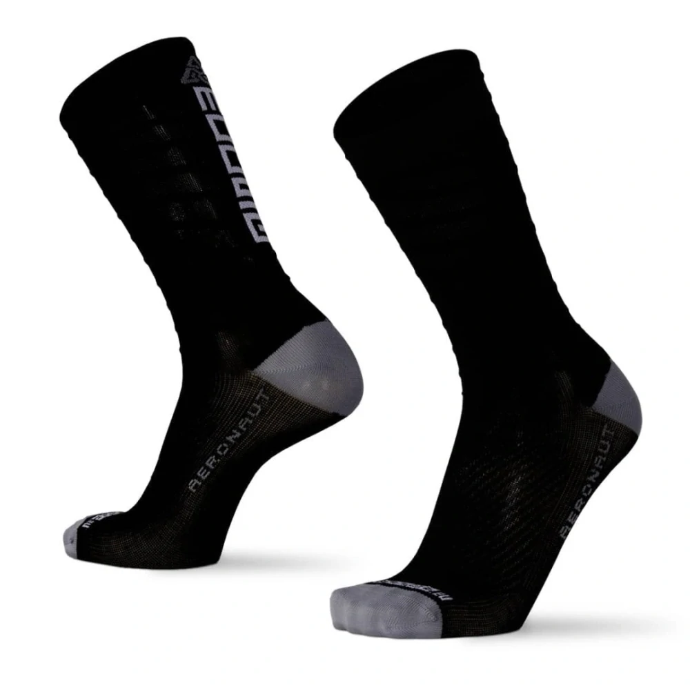Nekompromisní cyklistická ponožka Compress AERONAUT s aerodynamickými prvky a kompresním provedením pro rychlou jízdu zejména na silnici nebo dráze. Aktuálně nejvyšší model celé cyklo řady kombinuje unikátní a náročná technická řešení s kvalitními materiály. Vyšší kompresní ponožka pevně drží na noze a použitý polyamid spolu s technickým řešením umožňuje plynulejší tok vzduchu kolem nohy. Jemné plyšování nad patou zvyšuje komfort při jízdě, zatímco technická kombinace elastanů a "bavlněného" polyesteru na chodidle přináší zejména snížení kluzkosti ponožky v botě a tím lepší přenos síly přes botu do pedálů. Při použití se může projevit žmolkování materiálu, což je však v tomto případě žádoucí, neboť dochází k dalšímu zafixování ponožky v tretře. Plochý šev pak zajišťuje ochranu pro citlivé prsty a zesílená pata a špice dostatečně dlouhou životnost.