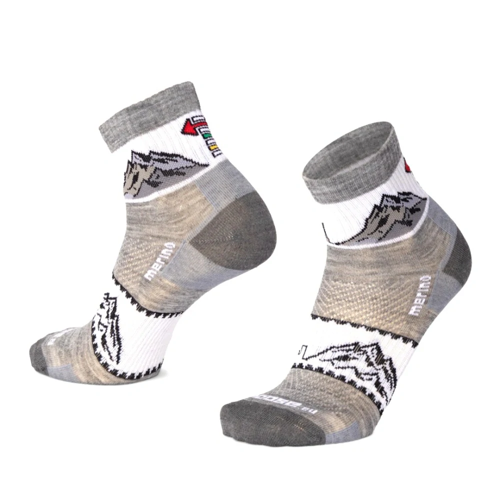 Řada ORLIK Merino by samozřejmě nebyla kompletní bez obrázku s turistickou tématikou. Grafika se směrovými šipkami, horami a městem předurčují tyto ponožky pro o celoroční využití pro nejrůznější sportovní aktivity, ale třeba také jako pohodlné ponožky pro chvíle volna nebo do práce. Ponožky jsou v hladkém provedení s jemnou větrací síťkou na nártu. Vyrobeny jsou jako mírně snížené, dobře tedy padnou do nízkých a středně vysokých bot. Zachovávají si sportovní střih, Achilovka, pata, špice i část chodidla jsou opatřena dodatečným zesilováním. Klenba chodidla je navíc podpořena elastickým páskem proti klouzání ponožky. Špička je jako vždy zakončena kvalitním, jemným, netlačícím švem. Nosným prvkem této řady je kvalitní Merino vlna v kombinaci s různými typy elastanů a italskými polyamidy