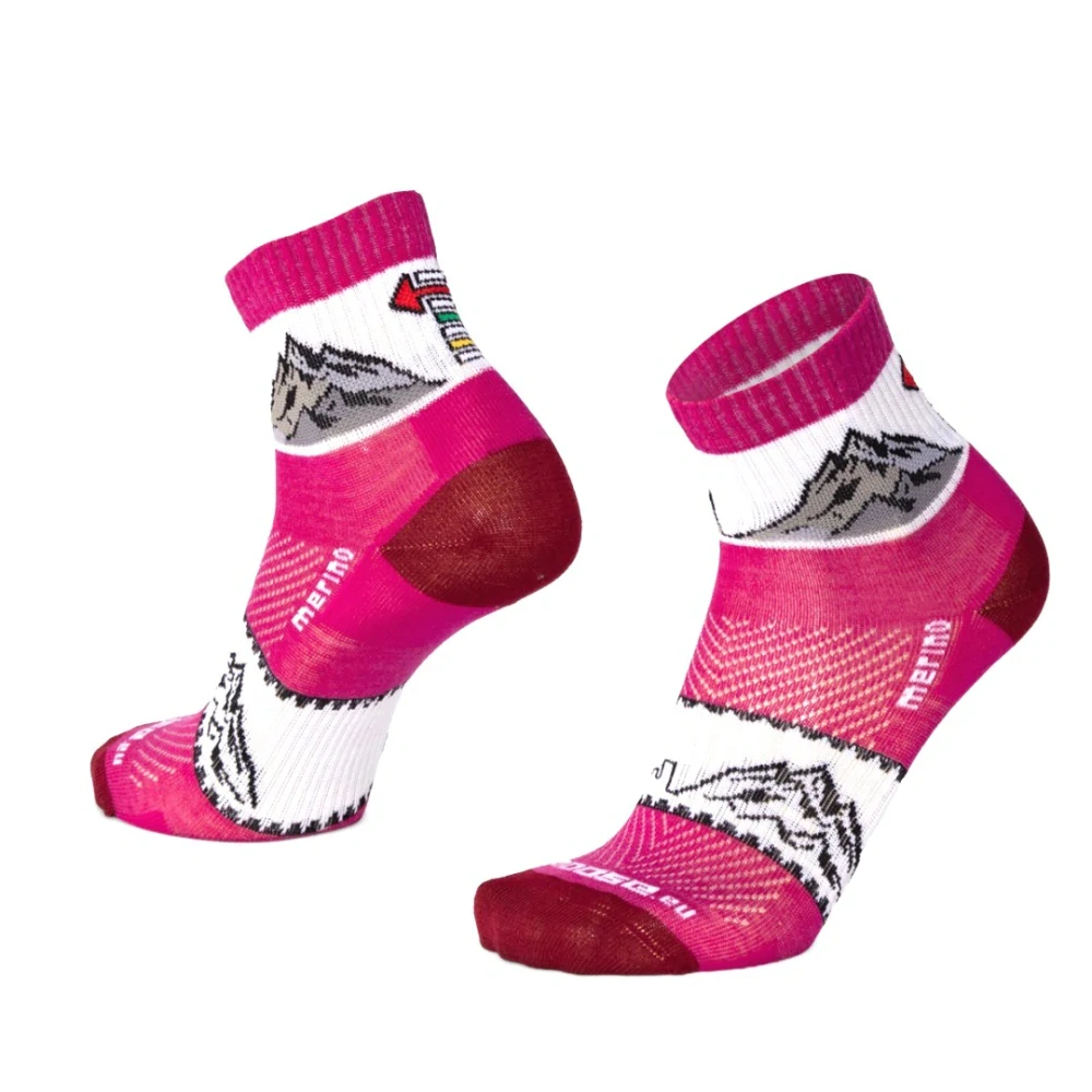 Řada ORLIK Merino by samozřejmě nebyla kompletní bez obrázku s turistickou tématikou. Grafika se směrovými šipkami, horami a městem předurčují tyto ponožky pro o celoroční využití pro nejrůznější sportovní aktivity, ale třeba také jako pohodlné ponožky pro chvíle volna nebo do práce. Ponožky jsou v hladkém provedení s jemnou větrací síťkou na nártu. Vyrobeny jsou jako mírně snížené, dobře tedy padnou do nízkých a středně vysokých bot. Zachovávají si sportovní střih, Achilovka, pata, špice i část chodidla jsou opatřena dodatečným zesilováním. Klenba chodidla je navíc podpořena elastickým páskem proti klouzání ponožky. Špička je jako vždy zakončena kvalitním, jemným, netlačícím švem. Nosným prvkem této řady je kvalitní Merino vlna v kombinaci s různými typy elastanů a italskými polyamidy