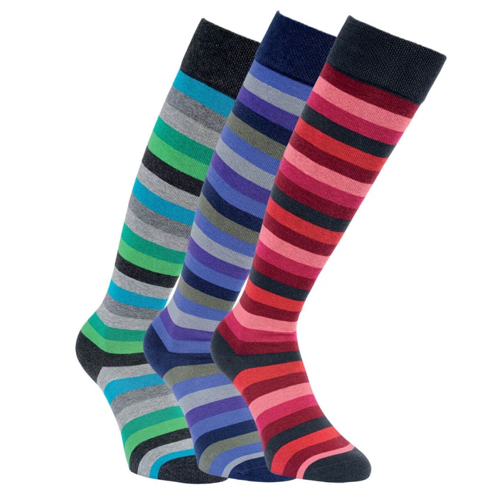 Barevné dámské pruhované bavlněné elastické podkolenky v zářivých barvách. Podkolenky jsou dostatečně dlouhé a skvěle roztažné, mají zesílenou patu a špici a příjemný vaflový lem. Módní podzimní barvy! Vysoký obsah bavlny. Balení 3 páry. Barva: mix barevných pruhů.