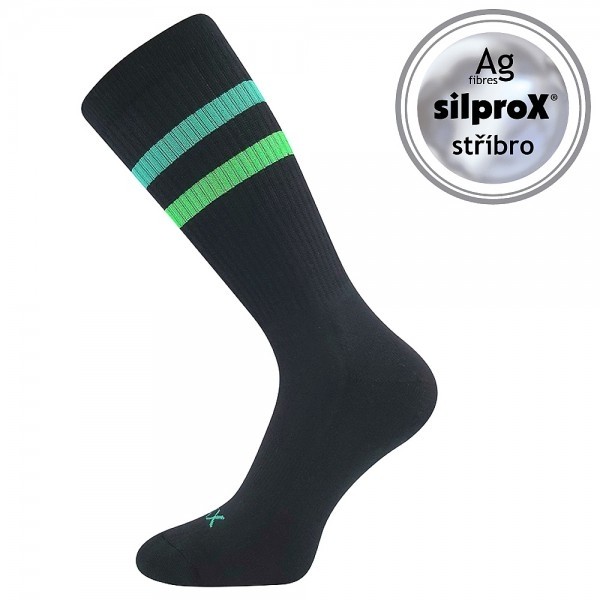 Pánské sportovní ponožky VoXX® RETRAN jsou vysoké ponožky pro tenis a halové sporty. Spojení retro designu a moderní technologie výroby a materiálů přírodní bavlny a antibakteriálního materiálu silproX® s ionty stříbra oceníte i po náročném sportovním výkonu, kdy ponožky ani nohy nebudou zapáchat. Vysoký podíl bavlny je příjemný na nošení. Speciální konstrukce na nártu zabraňuje přetočení v botě, polstrované zóny chrání nohu proti otlakům a puchýřům a volný jemný lem nohy nepříjemně nestahuje ani neškrtí. Antibakteriální ponožky jsou pro každodenní použití, teplotní třída ponožek je A, vhodné do teplot v rozmezí od +10°C do +35°C.